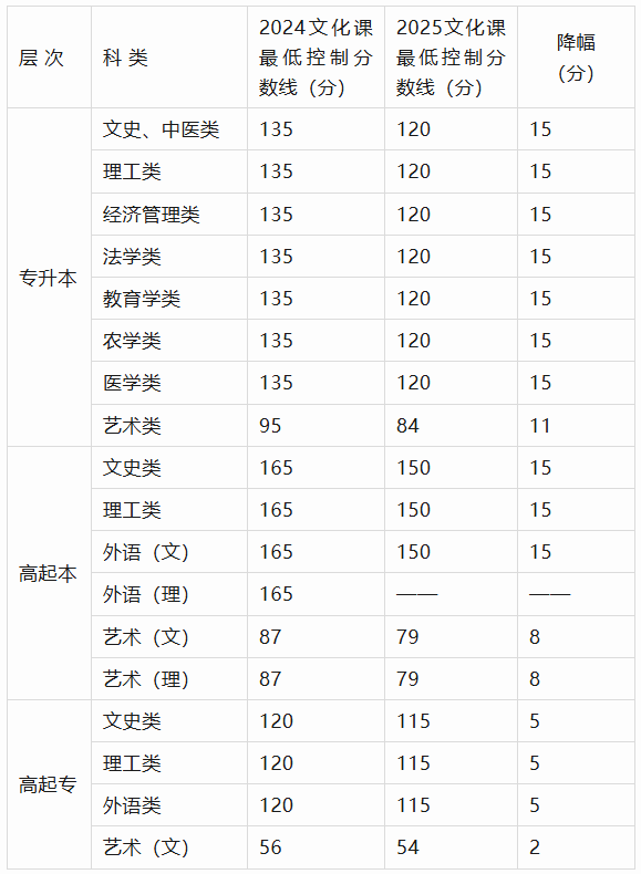2024年、2025年陕西省成人高校招生各科类录取最低控制分数线对比